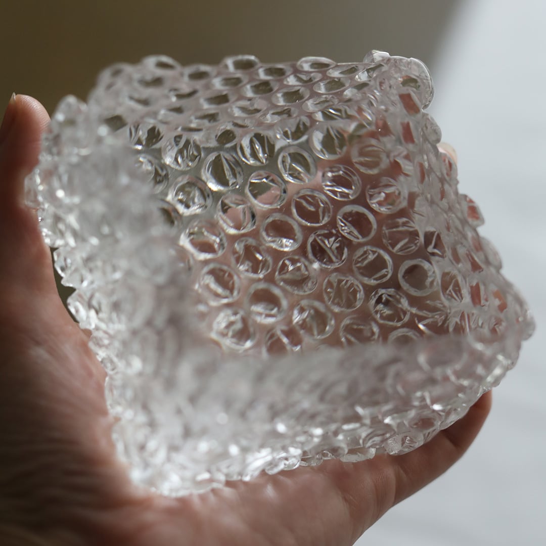 ガラス作家の板野尚美さんが普段からプチプチを使用することが多いのですが、ある日梱包中にふと「このプチプチをガラスに落とし込んでみたら、面白い表現になるのではないか?」というアイデアが浮かんだのがきっかけで制作した作品です。