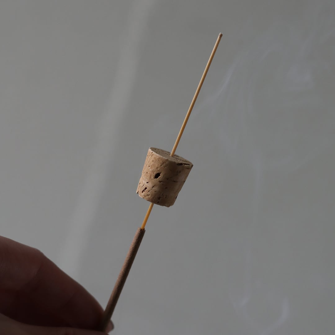 フタであるコルクにお香の枝の部分を差し込み、火を点け、逆さにしてお香立てのフタをするんです!