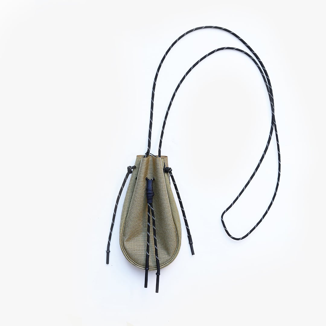 耐久性に優れたインビスタ社のコーデュラ生地※1と、リフレクター入りのパラコード※2を組み合わせたネイティブポーチのようなデザインの巾着バッグ。